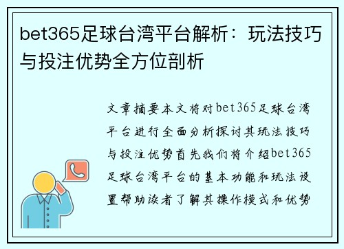 文章摘要:本文将对bet365足球台湾平台进行全面分析,探讨其玩法技巧与投注优势。首先,我们将介绍bet365足球台湾平台的基本功能和玩法设置,帮助读者了解其操作模式和优势。接着,我们会重点阐述投注技巧,包括如何利用赔率、分析比赛数据以及选择最佳投注时机。此外,还将分析bet365平台的安全性和便利性,为台湾地区的玩家提供保障。最后,文章将总结bet365足球台湾平台的独特之处,并提供一些使用建议,帮助玩家在平台上获得更好的投注体验。