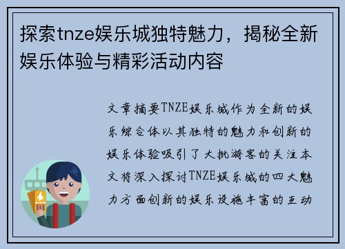 文章摘要:TNZE娱乐城作为全新的娱乐综合体,以其独特的魅力和创新的娱乐体验吸引了大批游客的关注。本文将深入探讨TNZE娱乐城的四大魅力方面:创新的娱乐设施、丰富的互动活动、独特的娱乐氛围以及贴心的服务体验。每一项内容都展现了TNZE娱乐城如何通过多元化的设计和活动来满足不同游客的需求。从刺激的游戏体验到多彩的社交活动,再到专业的服务团队和充满活力的氛围,TNZE娱乐城无疑为现代娱乐产业注入了新的活力。本文将为您揭开这些精彩活动背后的独特魅力,探索TNZE娱乐城如何通过全新的娱乐体验打造一个让人沉浸其中的乐园。