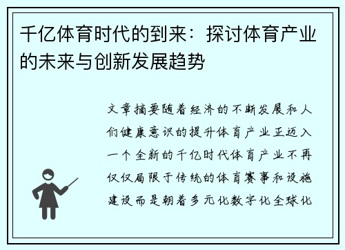 文章摘要:随着经济的不断发展和人们健康意识的提升,体育产业正迈入一个全新的千亿时代。体育产业不再仅仅局限于传统的体育赛事和设施建设,而是朝着多元化、数字化、全球化的方向迈进。在这个时代,体育不仅是一项竞技活动,更是文化、娱乐、商业和社会价值的综合体现。本文将从四个方面探讨千亿体育时代的到来,首先是体育产业的规模扩展与多元化发展,接着是数字化技术对体育产业的深度影响,然后是全球化趋势下体育产业的国际化布局,最后是创新驱动下的新型商业模式的出现。通过对这些发展趋势的分析,本文将对体育产业的未来进行展望,并为相关企业和从业者提供参考和启示。